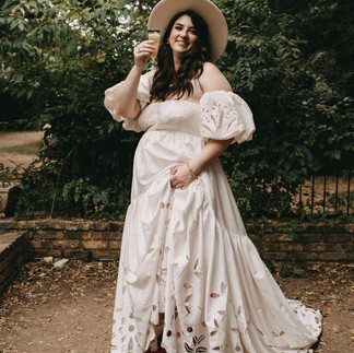 Her whimsical cottage garden theme was the perfect choice for Dani's wedding. The blush pink off-the-shoulder dress and charming decor, along with the vintage moon pin on her hat, were simply stunning. It was a charming escape from the ordinary.